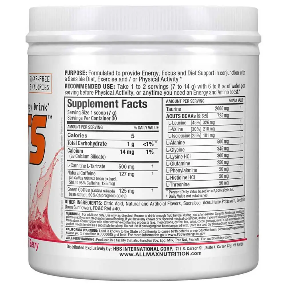 ACUTS provides you with energy to burn! Fortified with Natural-Source Caffeine, Green Coffee extract and L-Carnitine, ACUTS will supercharge your workout with the added benefit of focused fat loss. What’s even better is the addition of 2000mg of Taurine, a non-essential amino acid, and one of the most abundant amino acids in the body that can be found in the central nervous system, white blood cells, the brain and skeletal muscles.